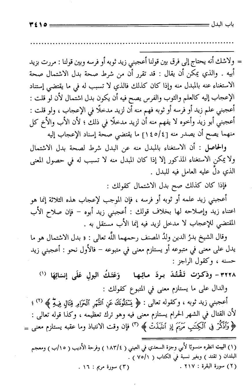 أعجبني زيد ثوبه، وكقوله تعالى: يَسْئَلُونَكَ عَنِ الشَّهْرِ الْحَرامِ قِتالٍ فِيهِ (¬2)؛ لأن القتال في الشهر الحرام يستلزم معنى فيه وهو ترك تعظيمه، وكذا قوله تعالى: