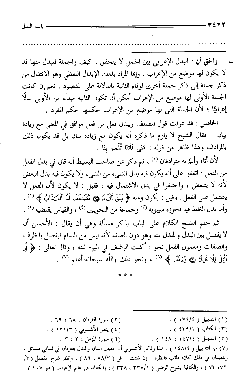 بدل الشيء من الشيء ولا يكون فيه بدل البعض لأنه لا يتبعض، واختلفوا في بدل الاشتمال فيه، فقيل: لا يكون لأن الفعل لا يشتمل على الفعل. وقيل: يكون ومنه يَلْقَ أَثاماً 68 يُضاعَفْ لَهُ الْعَذابُ (¬2).