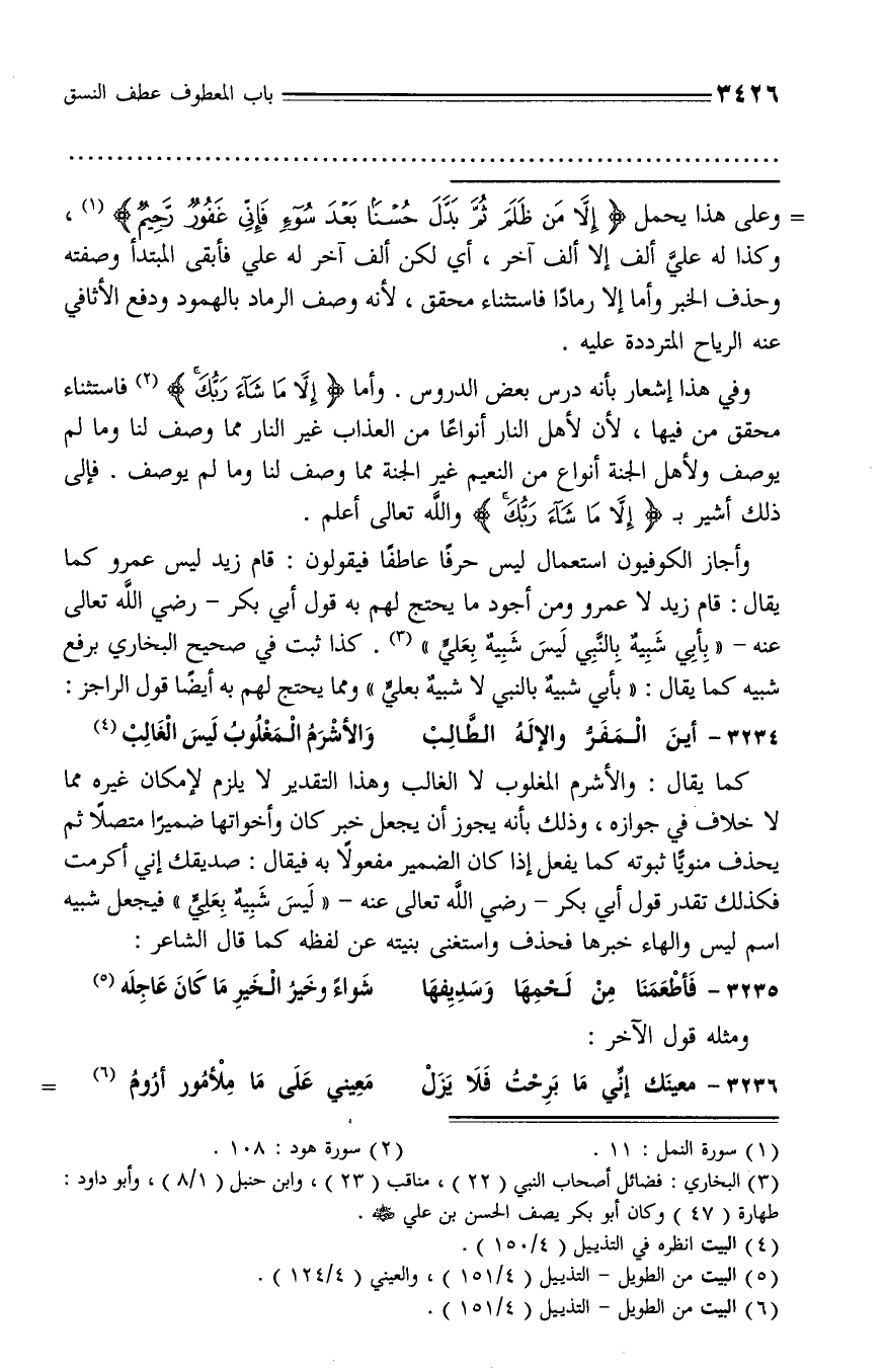 وأجاز الكوفيون استعمال ليس حرفا عاطفا فيقولون: قام زيد ليس عمرو كما يقال: قام زيد لا عمرو ومن أجود ما يحتج لهم به قول أبي بكر - رضي الله تعالى عنه - «بأبي شبيه بالنّبي ليس شبيه بعليّ» (¬3). كذا ثبت في صحيح البخاري يرفع شبيه كما يقال: «بأبي شبيه بالنبي لا شبيه بعليّ» ومما يحتج لهم به أيضا قول الراجز: