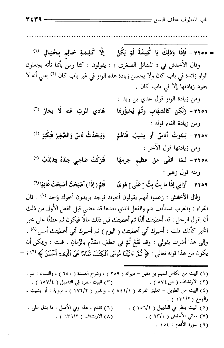وإلى هذا أشرت بقولي: وقد تقع ثمّ في عطف المقدّم بالزّمان. قلت: ويمكن أن يكون من هذا قوله تعالى: ثُمَّ آتَيْنا مُوسَى الْكِتابَ تَماماً عَلَى الَّذِي أَحْسَنَ (¬9)؛ -