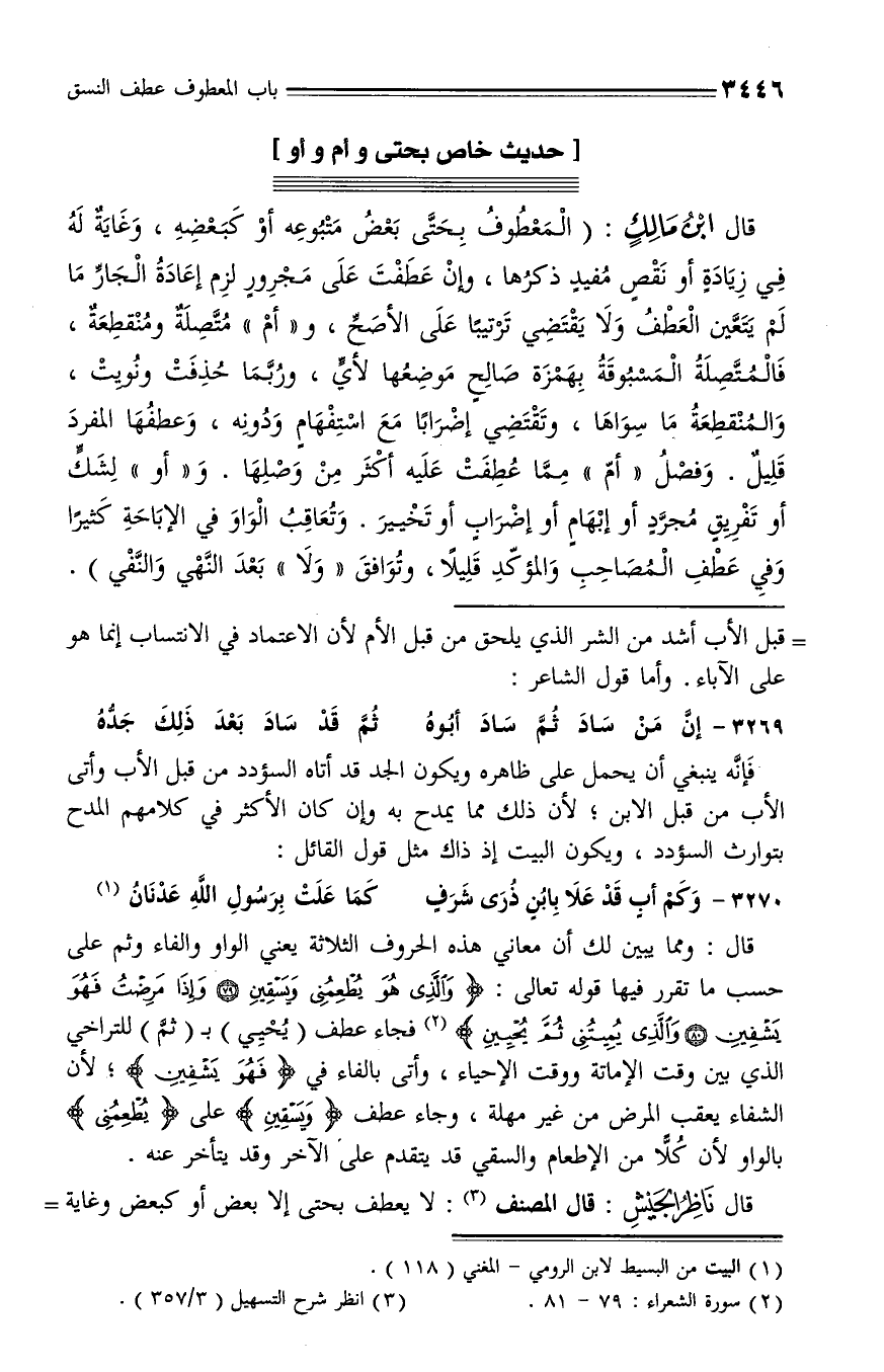 قال ابن مالك: (المعطوف بحتّى بعض متبوعه أو كبعضه، وغاية له في زيادة أو نقص مفيد ذكرها، وإن عطفت على مجرور لزم إعادة الجارّ ما لم يتعّين العطف ولا يقتضي ترتيبا على الأصحّ، و «أم» متّصلة ومنقطعة، فالمتّصلة المسبوقة بهمزة صالح موضعها لأيّ، وربّما حذفت ونويت، والمنقطعة ما سواها، وتقتضي إضرابا مع استفهام ودونه، وعطفها المفرد قليل. وفصل «أمّ» ممّا عطفت عليه أكثر من وصلها. و «أو» لشكّ أو تفريق مجرّد أو إبهام أو إضراب أو تخيير. وتعاقب الواو في الإباحة كثيرا وفي عطف المصاحب والمؤكّد قليلا، وتوافق «ولا» بعد النّهي والنّفي).