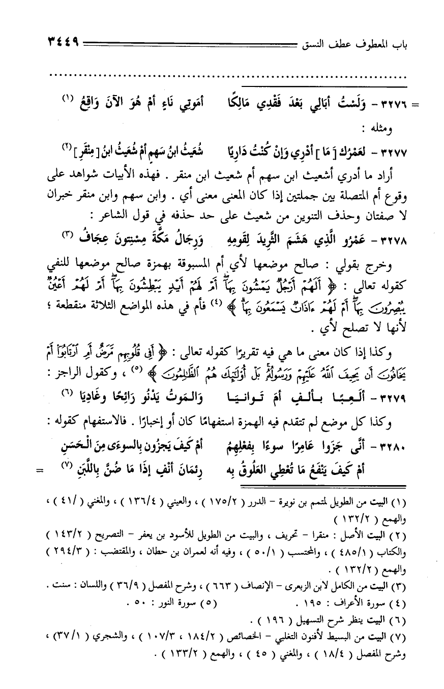 أراد ما أدري أشعيث ابن سهم أم شعيث ابن منقر. فهذه الأبيات شواهد على وقوع أم المتصلة بين جملتين إذا كان المعنى معنى أي. وابن سهم وابن منقر خبران لا صفتان وحذف التنوين من شعيث على حد حذفه في قول الشاعر: