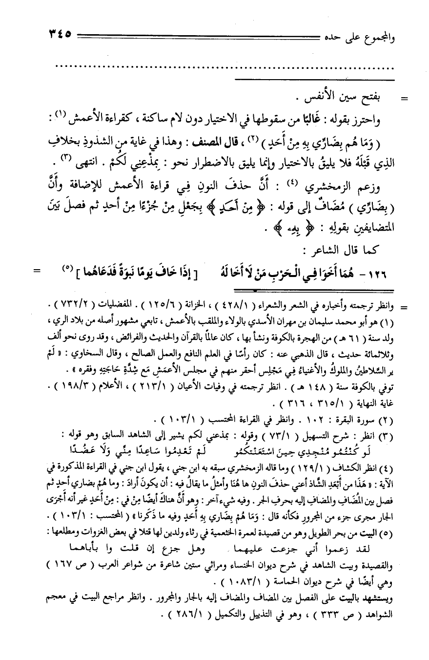 (¬4) انظر الكشاف (1/ 129) وما قاله الزمخشري سبقه به ابن جني، يقول ابن جني في القراءة المذكورة في الآية: «هذا من أبعد الشّاذ أعني حذف النون ها هنا وأمثل ما يقال فيه: أن يكون أراد: وما هم بضاري أحد ثم فصل بين المضاف والمضاف إليه بحرف الجر. وفيه شيء آخر: وهو أنّ هناك أيضا من في: من أحد غير أنه أجرى الجار مجرى جزء من المجرور فكأنه قال: وما هم بضاري به أحد وفيه ما ذكرنا» (المحتسب: 1/ 103).