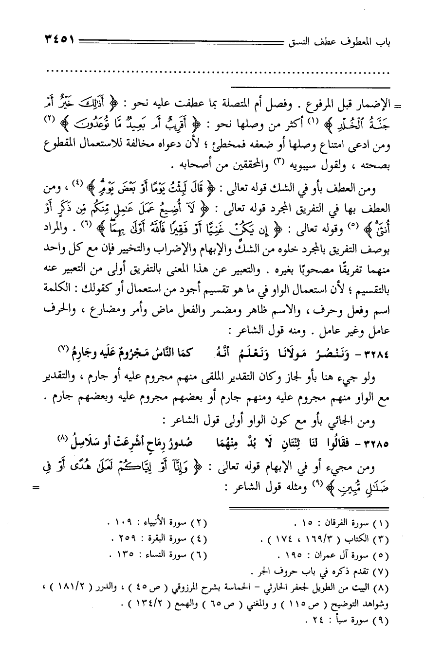 الإضمار قبل المرفوع. وفصل أم المتصلة بما عطفت عليه نحو: أَذلِكَ خَيْرٌ أَمْ جَنَّةُ الْخُلْدِ (¬1) أكثر من وصلها نحو: أَقَرِيبٌ أَمْ بَعِيدٌ ما تُوعَدُونَ (¬2) ومن ادعى امتناع وصلها أو ضعفه فمخطئ؛ لأن دعواه مخالفة للاستعمال المقطوع بصحته، ولقول سيبويه (¬3) والمحققين من أصحابه.