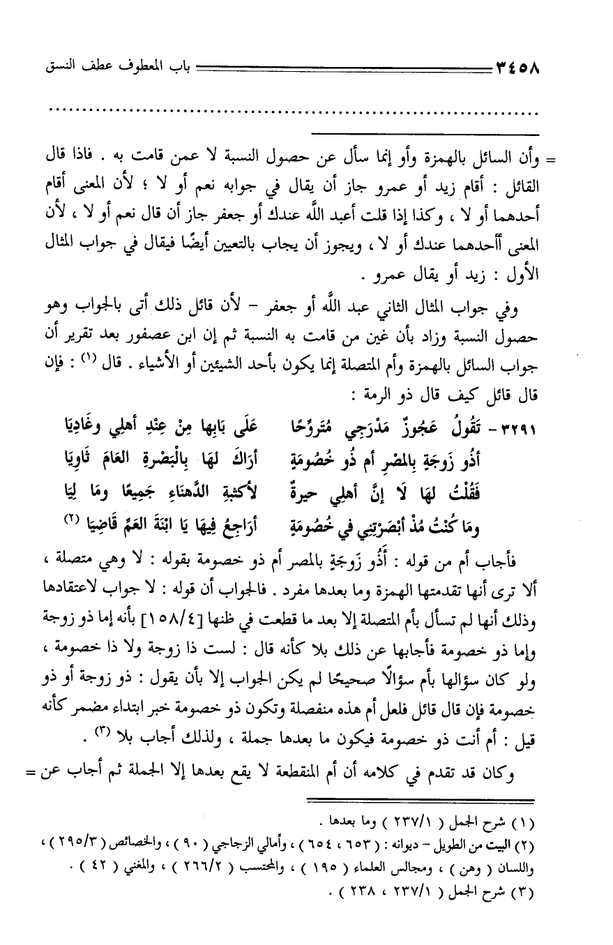 فأجاب أم من قوله: أذو زوجة بالمصر أم ذو خصومة بقوله: لا وهي متصلة، ألا ترى أنها تقدمتها الهمزة وما بعدها مفرد. فالجواب أن قوله: لا جواب لاعتقادها وذلك أنها لم تسأل بأم المتصلة إلا بعد ما قطعت في ظنها [4/ 158] بأنه إما ذو زوجة وإما ذو خصومة فأجابها عن ذلك بلا كأنه قال: لست ذا زوجة ولا ذا خصومة، ولو كان سؤالها بأم سؤالا صحيحا لم يكن الجواب إلا بأن يقول: ذو زوجة أو ذو خصومة فإن قال قائل فلعل أم هذه منفصلة وتكون ذو خصومة خبر ابتداء مضمر كأنه قيل: أم أنت ذو خصومة فيكون ما بعدها جملة، ولذلك أجاب بلا (¬3).