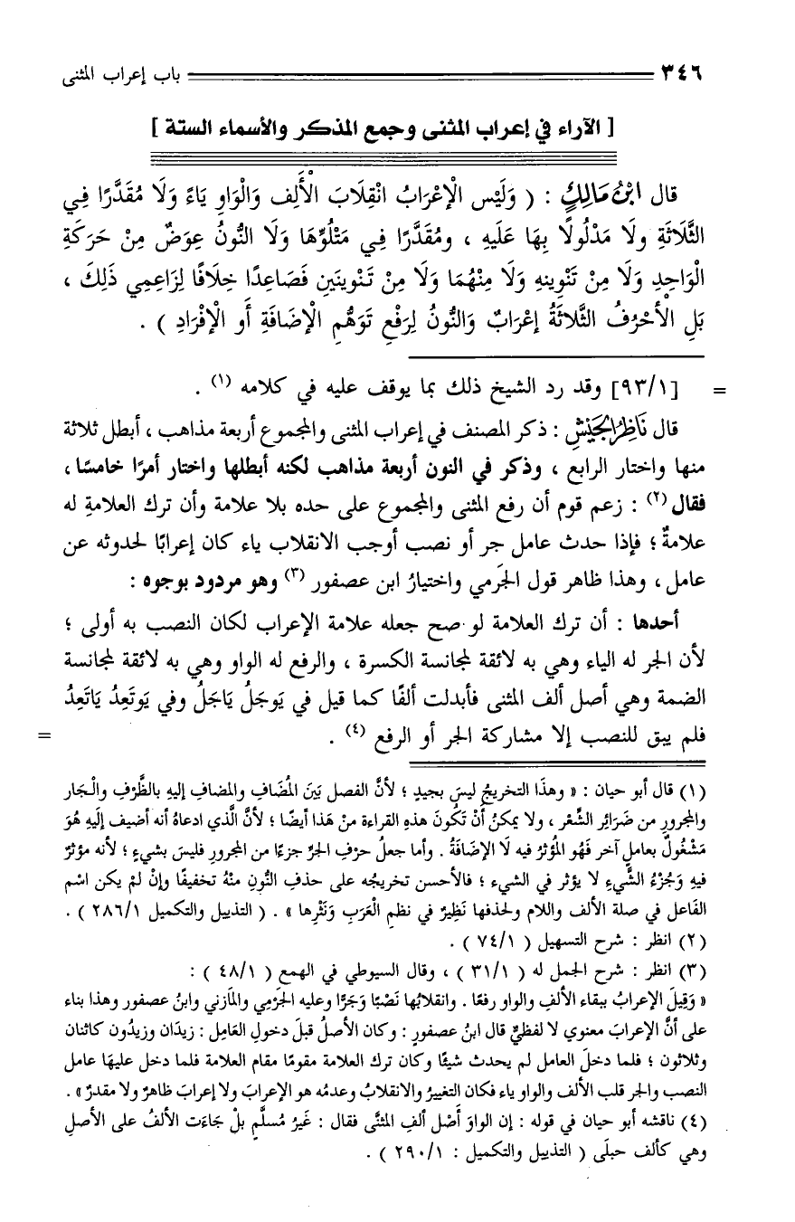 (¬4) ناقشه أبو حيان في قوله: إن الواو أصل ألف المثنّى فقال: غير مسلّم بل جاءت الألف على الأصل وهي كألف حبلى (التذييل والتكميل: 1/ 290).