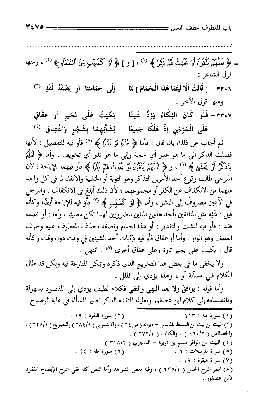 ثم أجاب عن ذلك بأن قال: فأما عُذْراً أَوْ نُذْراً (¬5) فأو فيه للتفصيل؛ لأنها فصلت الذكر إلى ما هو عذر أي حجة وإلى ما هو نذر أي تخويف. وأما لَعَلَّهُ يَتَذَكَّرُ أَوْ يَخْشى (¬6)، ولَعَلَّهُمْ يَتَّقُونَ أَوْ يُحْدِثُ لَهُمْ ذِكْراً فأو فيهما للإباحة؛ لأن المترجي طالب وقوع أحد الأمرين التذكر وهو التوبة أو الخشية والاتقاء لما في كل واحد منهما من الانكفاف عن الكفر أو مجموعهما؛ لأن ذلك أبلغ في الانكفاف، والترجي في الآيتين مصروف إلى البشر، وأما أَوْ كَصَيِّبٍ (¬7) فأو فيه للإباحة أيضا وكأنه قيل: شبّه مثل المنافقين بأحد هذين المثلين المضروبين لهما تكن مصيبا، وأما: أو نصفه فقد: فأو فيه للشك والتقدير: أو هذا الحمام ونصفه فحذف المعطوف عليه وحرف العطف وهو الواو. وأما أو عقاق فأو فيه لإثبات أحد الشيئين في وقت دون وقت وكأنه قال: بكيت على بجير تارة وعلى عقاق أخرى (¬8). انتهى.