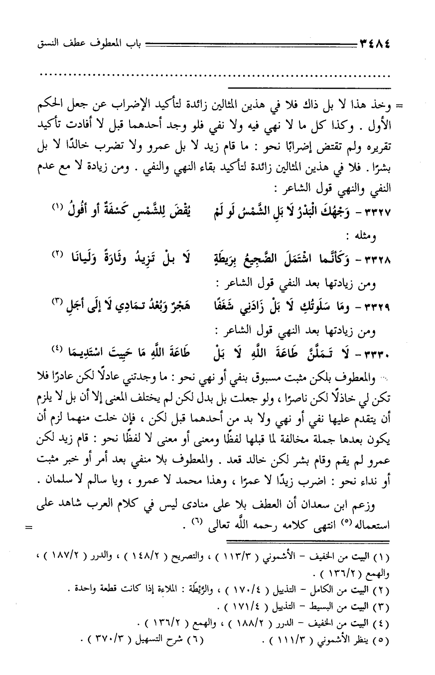 والمعطوف بلكن مثبت مسبوق بنفي أو نهي نحو: ما وجدتني عادلا لكن عادرا فلا تكن لي خاذلا لكن ناصرا، ولو جعلت بل بدل لكن لم يختلف المعنى إلا أن بل لا يلزم أن يتقدم عليها نفي أو نهي ولا بد من أحدهما قبل لكن، فإن خلت منهما لزم أن يكون بعدها جملة مخالفة لما قبلها لفظا ومعنى أو معنى لا لفظا نحو: قام زيد لكن عمرو لم يقم وقام بشر لكن خالد قعد. والمعطوف بلا منفي بعد أمر أو خبر مثبت أو نداء نحو: اضرب زيدا لا عمرا، وهذا محمد لا عمرو، ويا سالم لا سلمان.