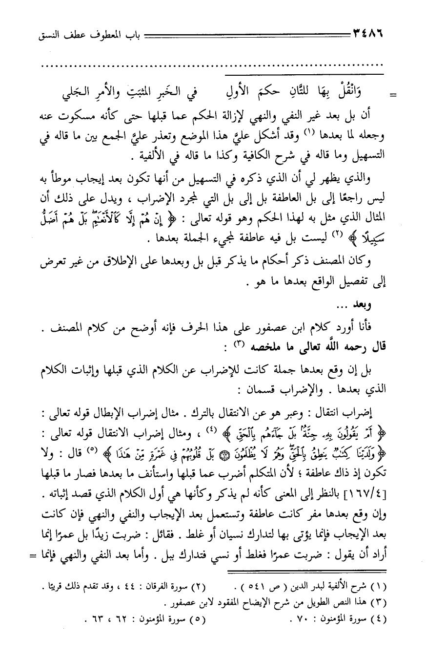 أن بل بعد غير النفي والنهي لإزالة الحكم عما قبلها حتى كأنه مسكوت عنه وجعله لما بعدها (¬1) وقد أشكل عليّ هذا الموضع وتعذر عليّ الجمع بين ما قاله في التسهيل وما قاله في شرح الكافية وكذا ما قاله في الألفية.