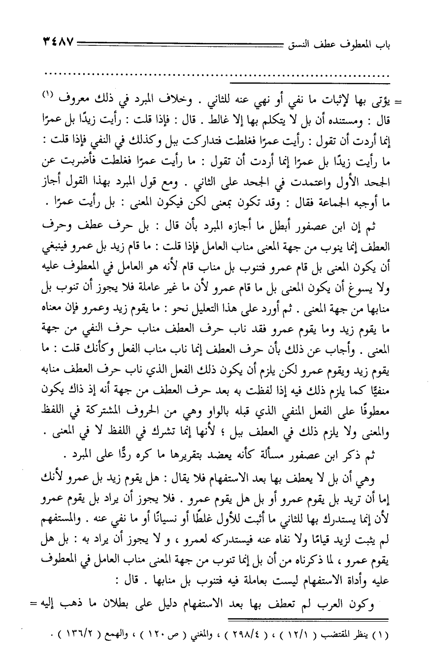 ثم إن ابن عصفور أبطل ما أجازه المبرد بأن قال: بل حرف عطف وحرف العطف إنما ينوب من جهة المعنى مناب العامل فإذا قلت: ما قام زيد بل عمرو فينبغي أن يكون المعنى بل قام عمرو فتنوب بل مناب قام لأنه هو العامل في المعطوف عليه ولا يسوغ أن يكون المعنى بل ما قام عمرو لأن ما غير عاملة فلا يجوز أن تنوب بل منابها من جهة المعنى. ثم أورد على هذا التعليل نحو: ما يقوم زيد وعمرو فإن معناه ما يقوم زيد وما يقوم عمرو فقد ناب حرف العطف مناب حرف النفي من جهة المعنى. وأجاب عن ذلك بأن حرف العطف إنما ناب مناب الفعل وكأنك قلت: ما يقوم زيد ويقوم عمرو لكن يلزم أن يكون ذلك الفعل الذي ناب حرف العطف منابه منفيّا كما يلزم ذلك فيه إذا لفظت به بعد حرف العطف من جهة أنه إذ ذاك يكون معطوفا على الفعل المنفي الذي قبله بالواو وهي من الحروف المشتركة في اللفظ والمعنى ولا يلزم ذلك في العطف ببل؛ لأنها إنما تشرك في اللفظ لا في المعنى.
