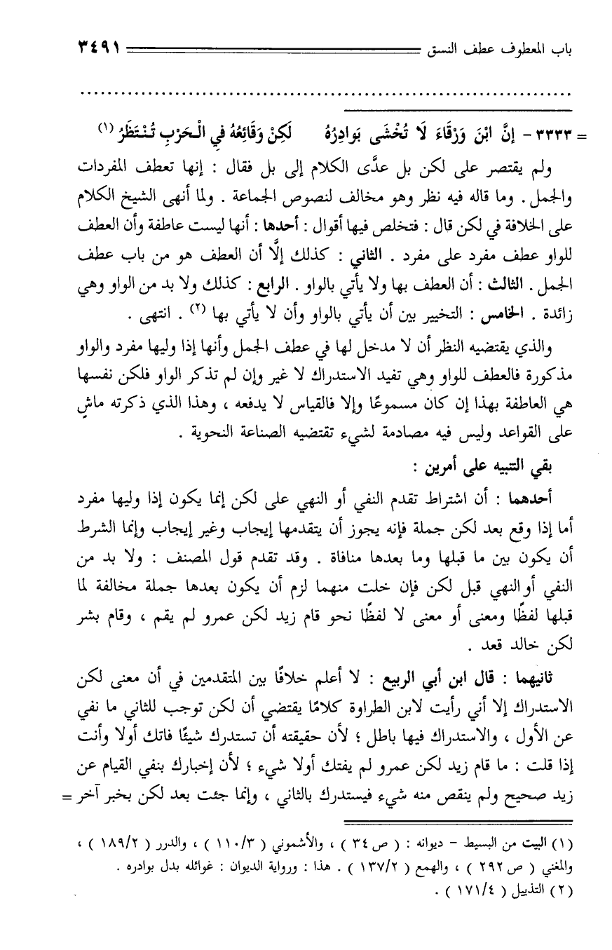 ولم يقتصر على لكن بل عدّى الكلام إلى بل فقال: إنها تعطف المفردات والجمل. وما قاله فيه نظر وهو مخالف لنصوص الجماعة. ولما أنهى الشيخ الكلام على الخلافة في لكن قال: فتخلص فيها أقوال: أحدها: أنها ليست عاطفة وأن العطف للواو عطف مفرد على مفرد. الثاني: كذلك إلّا أن العطف هو من باب عطف الجمل. الثالث: أن العطف بها ولا يأتي بالواو. الرابع: كذلك ولا بد من الواو وهي زائدة. الخامس: التخيير بين أن يأتي بالواو وأن لا يأتي بها (¬2). انتهى.
