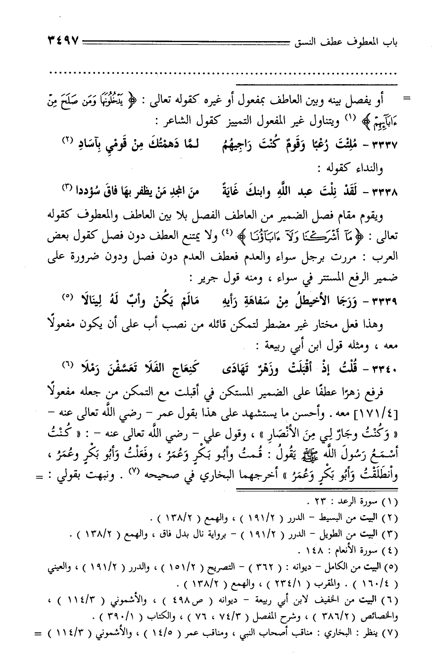 فرفع زهرا عطفا على الضمير المستكن في أقبلت مع التمكن من جعله مفعولا [4/ 171] معه. وأحسن ما يستشهد على هذا بقول عمر - رضي الله تعالى عنه - «وكنت وجار لي من الأنصار»، وقول علي - رضي الله تعالى عنه -: «كنت أسمع رسول الله صلّى الله عليه وسلّم يقول: قمت وأبو بكر وعمر، وفعلت وأبو بكر وعمر، وانطلقت وأبو بكر وعمر» أخرجهما البخاري في صحيحه (¬7). ونبهت بقولي: -