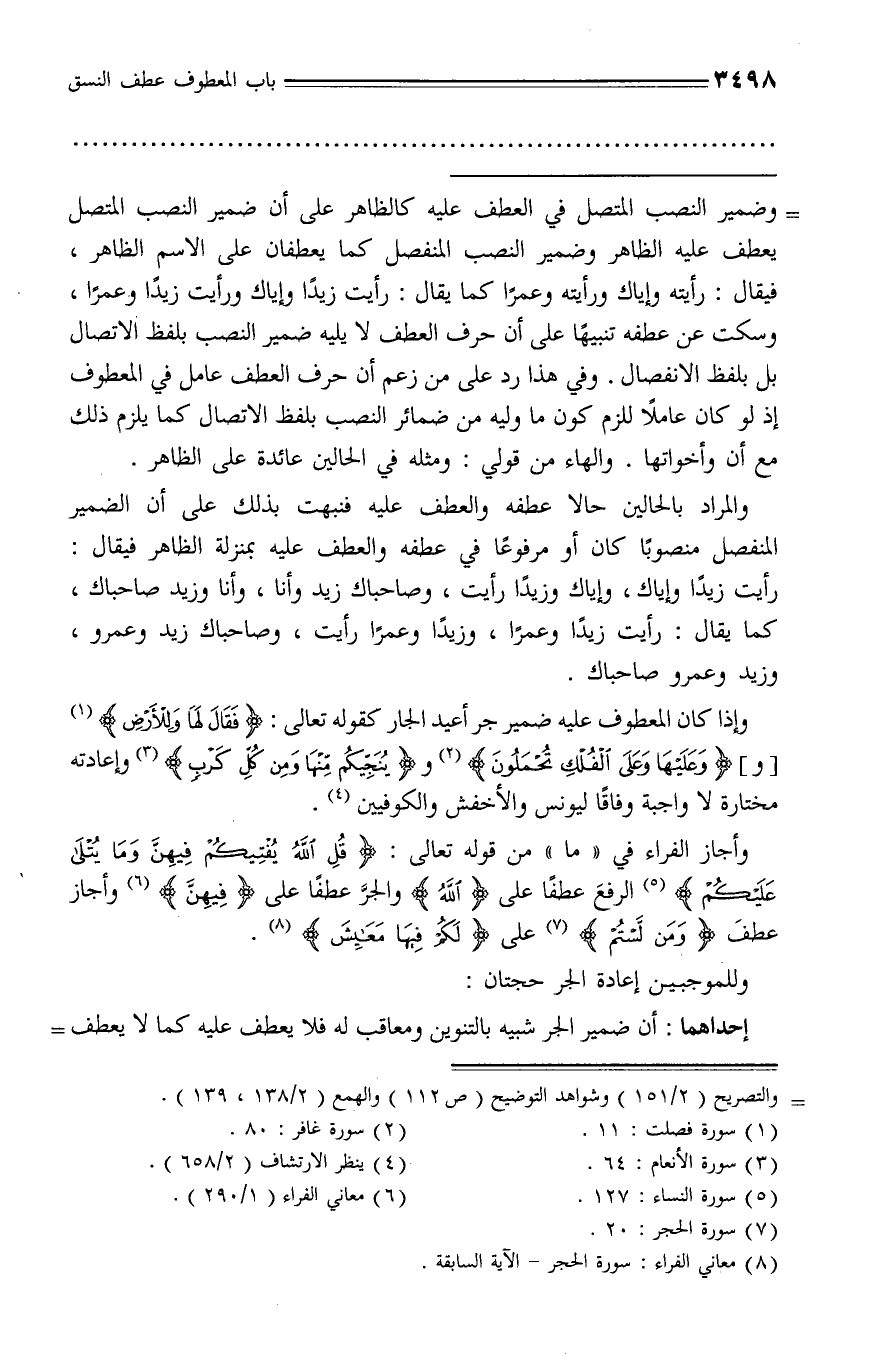 وضمير النصب المتصل في العطف عليه كالظاهر على أن ضمير النصب المتصل يعطف عليه الظاهر وضمير النصب المنفصل كما يعطفان على الاسم الظاهر، فيقال: رأيته وإياك ورأيته وعمرا كما يقال: رأيت زيدا وإياك ورأيت زيدا وعمرا، وسكت عن عطفه تنبيها على أن حرف العطف لا يليه ضمير النصب بلفظ الاتصال بل بلفظ الانفصال. وفي هذا رد على من زعم أن حرف العطف عامل في المعطوف إذ لو كان عاملا للزم كون ما وليه من ضمائر النصب بلفظ الاتصال كما يلزم ذلك مع أن وأخواتها. والهاء من قولي: ومثله في الحالين عائدة على الظاهر.