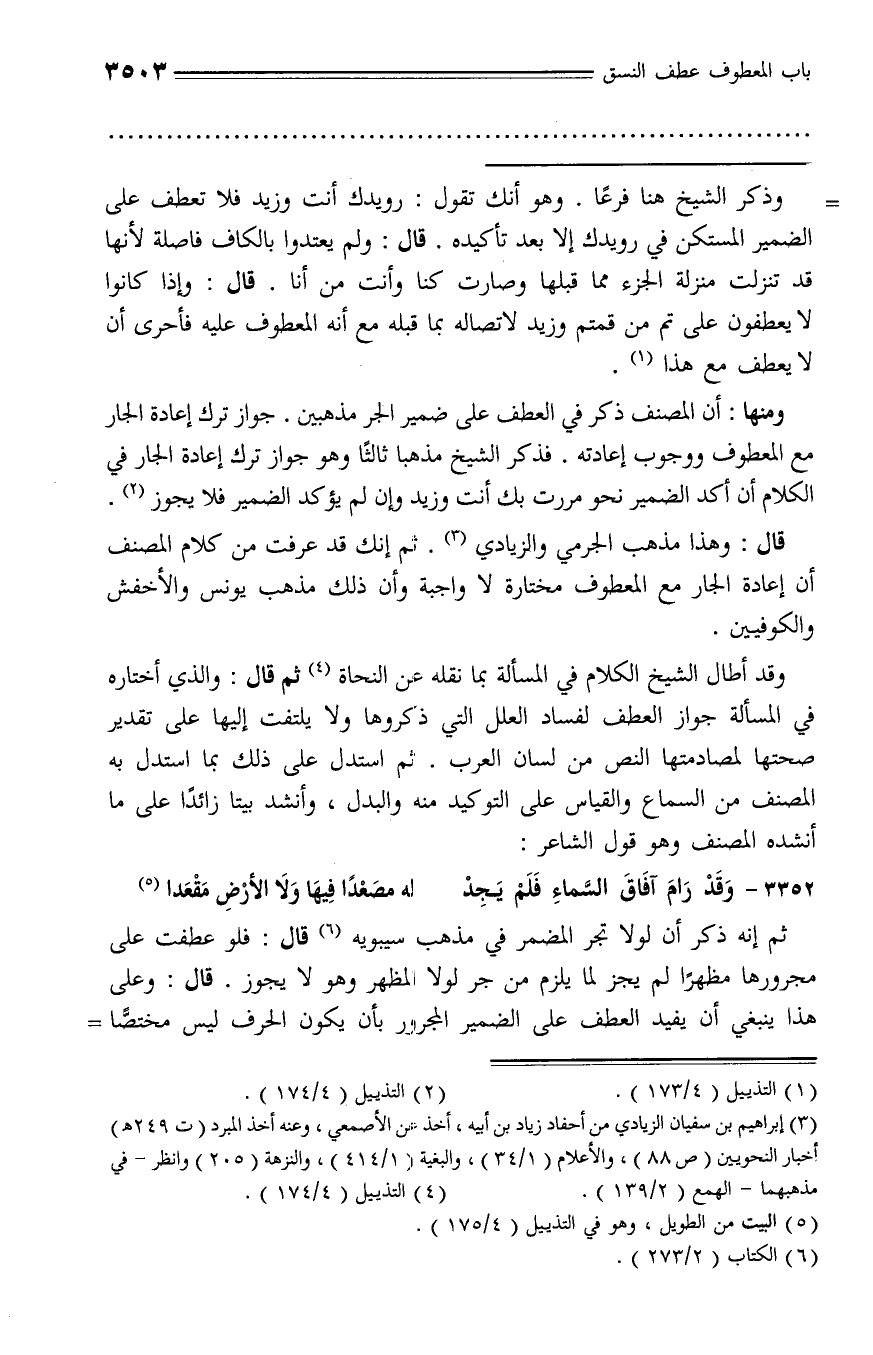 وذكر الشيخ هنا فرعا. وهو أنك تقول: رويدك أنت وزيد فلا تعطف على الضمير المستكن في رويدك إلا بعد تأكيده. قال: ولم يعتدوا بالكاف فاصلة لأنها قد تنزلت منزلة الجزء مما قبلها وصارت كنا وأنت من أنا. قال: وإذا كانوا لا يعطفون على تم من قمتم وزيد لاتصاله بما قبله مع أنه المعطوف عليه فأحرى أن لا يعطف مع هذا (¬1).