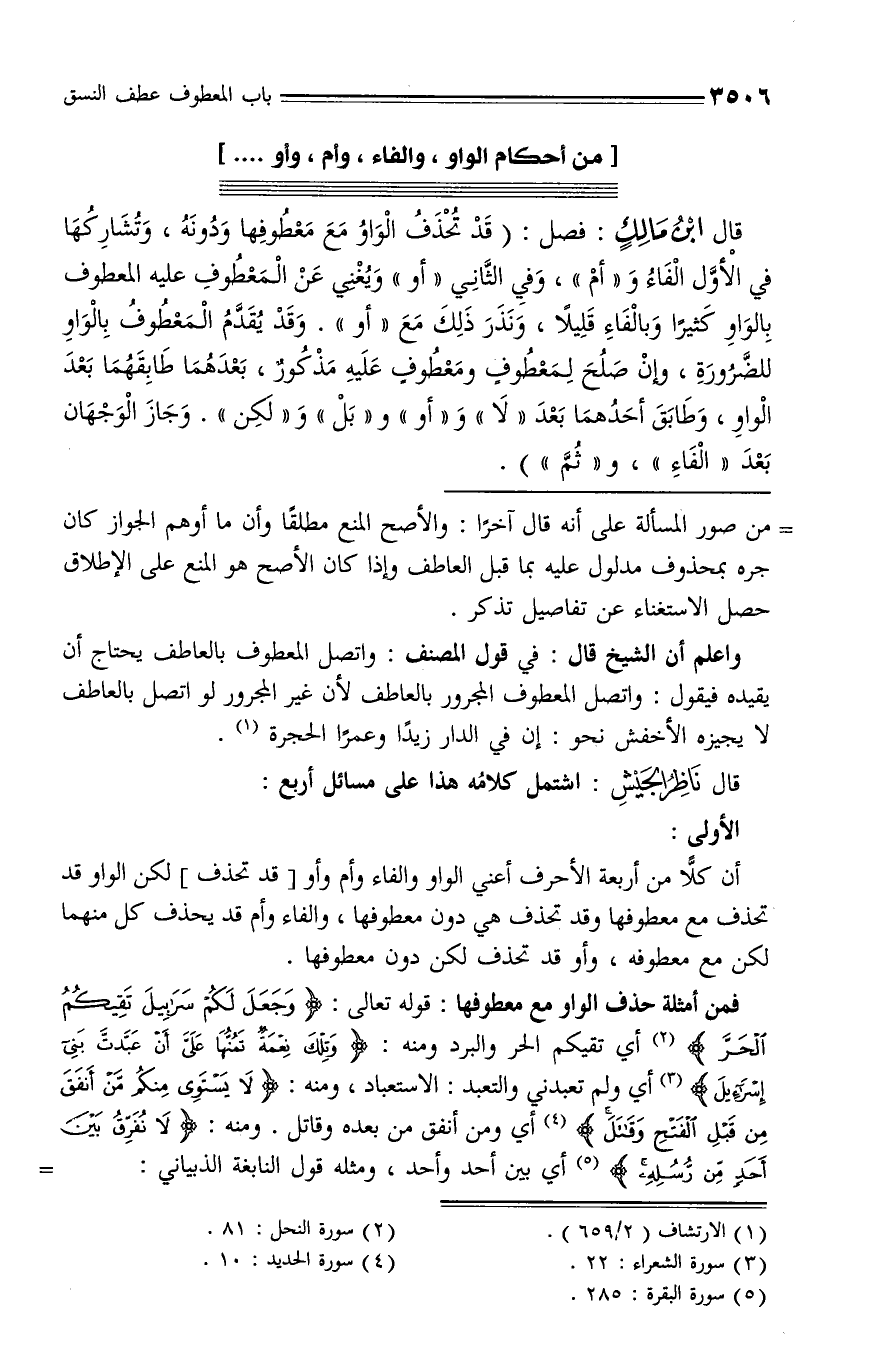 أن كلّا من أربعة الأحرف أعني الواو والفاء وأم وأو [قد تحذف] لكن الواو قد تحذف مع معطوفها وقد تحذف هي دون معطوفها، والفاء وأم قد يحذف كل منهما لكن مع معطوفه، وأو قد تحذف لكن دون معطوفها.