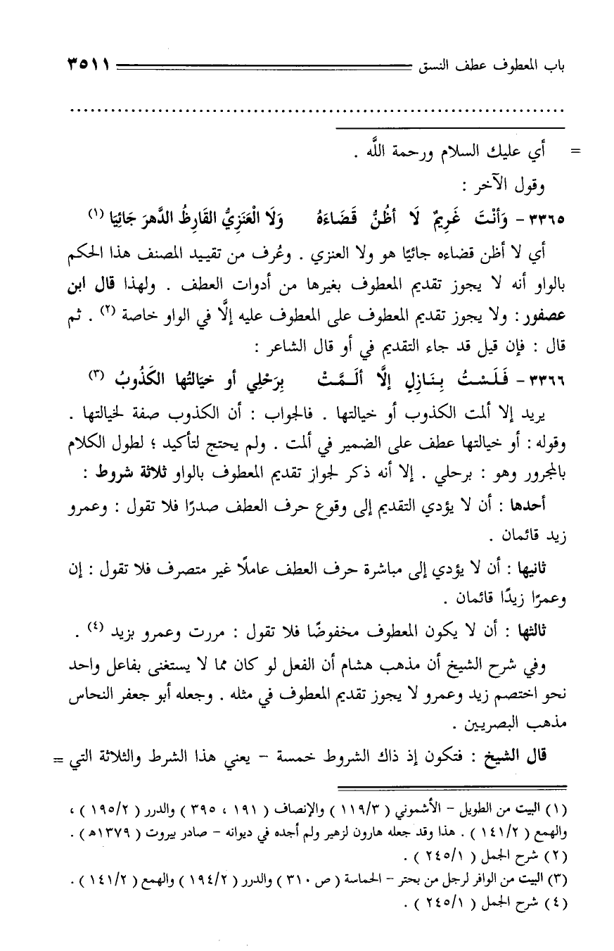 ثالثها: أن لا يكون المعطوف مخفوضا فلا تقول: مررت وعمرو بزيد (¬4).