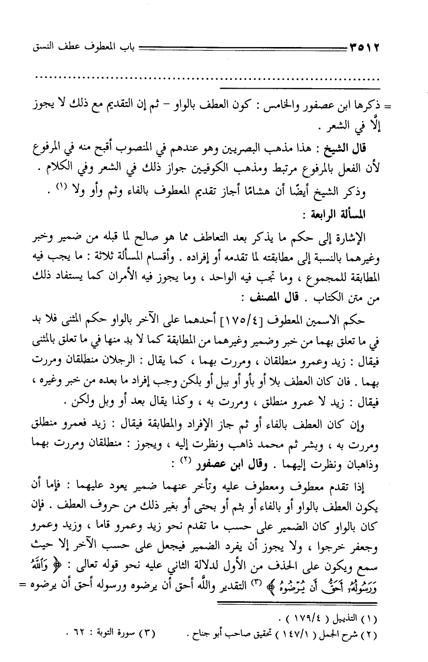 إذا تقدم معطوف ومعطوف عليه وتأخر عنهما ضمير يعود عليهما: فإما أن يكون العطف بالواو أو بالفاء أو بثم أو بحتى أو بغير ذلك من حروف العطف. فإن كان بالواو كان الضمير على حسب ما تقدم نحو زيد وعمرو قاما، وزيد وعمرو وجعفر خرجوا، ولا يجوز أن يفرد الضمير فيجعل على حسب الآخر إلا حيث سمع ويكون على الحذف من الأول لدلالة الثاني عليه نحو قوله تعالى: وَاللَّهُ وَرَسُولُهُ أَحَقُّ أَنْ يُرْضُوهُ (¬3) التقدير والله أحق أن يرضوه ورسوله أحق أن يرضوه -