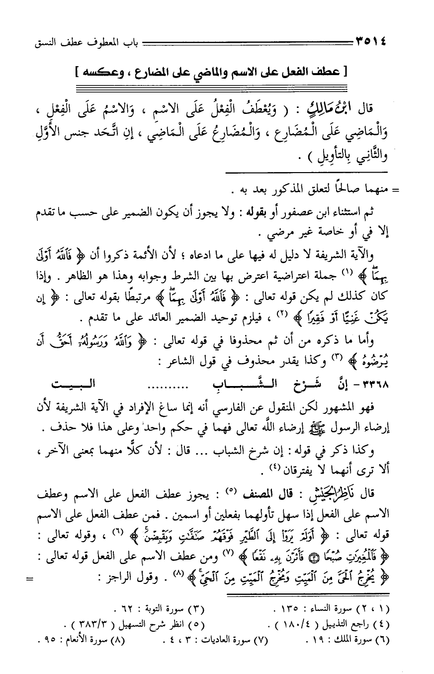 قال ناظر الجيش: قال المصنف (¬5): يجوز عطف الفعل على الاسم وعطف الاسم على الفعل إذا سهل تأولهما بفعلين أو اسمين. فمن عطف الفعل على الاسم قوله تعالى: أَوَلَمْ يَرَوْا إِلَى الطَّيْرِ فَوْقَهُمْ صافَّاتٍ وَيَقْبِضْنَ (¬6)، وقوله تعالى: