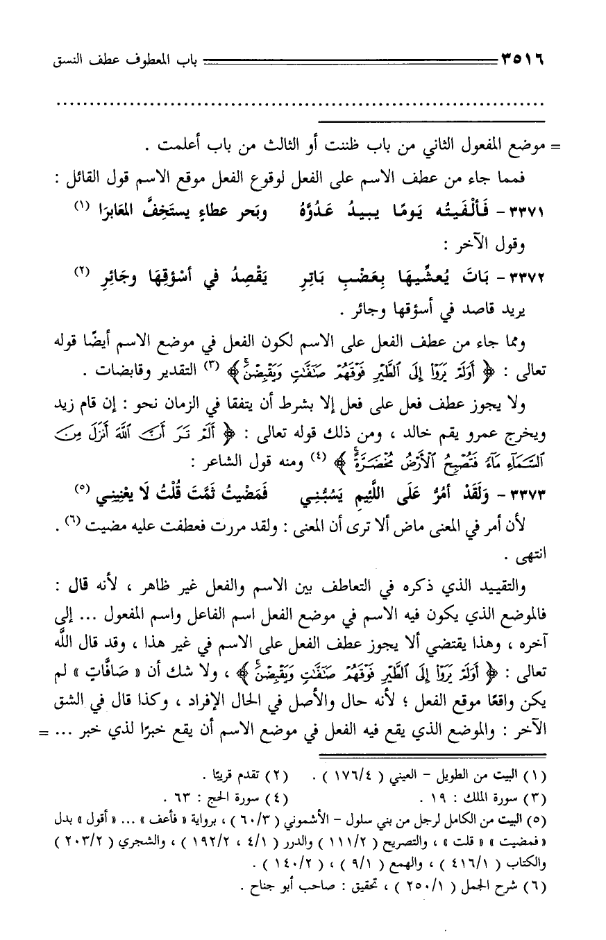 ومما جاء من عطف الفعل على الاسم لكون الفعل في موضع الاسم أيضا قوله تعالى: أَوَلَمْ يَرَوْا إِلَى الطَّيْرِ فَوْقَهُمْ صافَّاتٍ وَيَقْبِضْنَ (¬3) التقدير وقابضات.