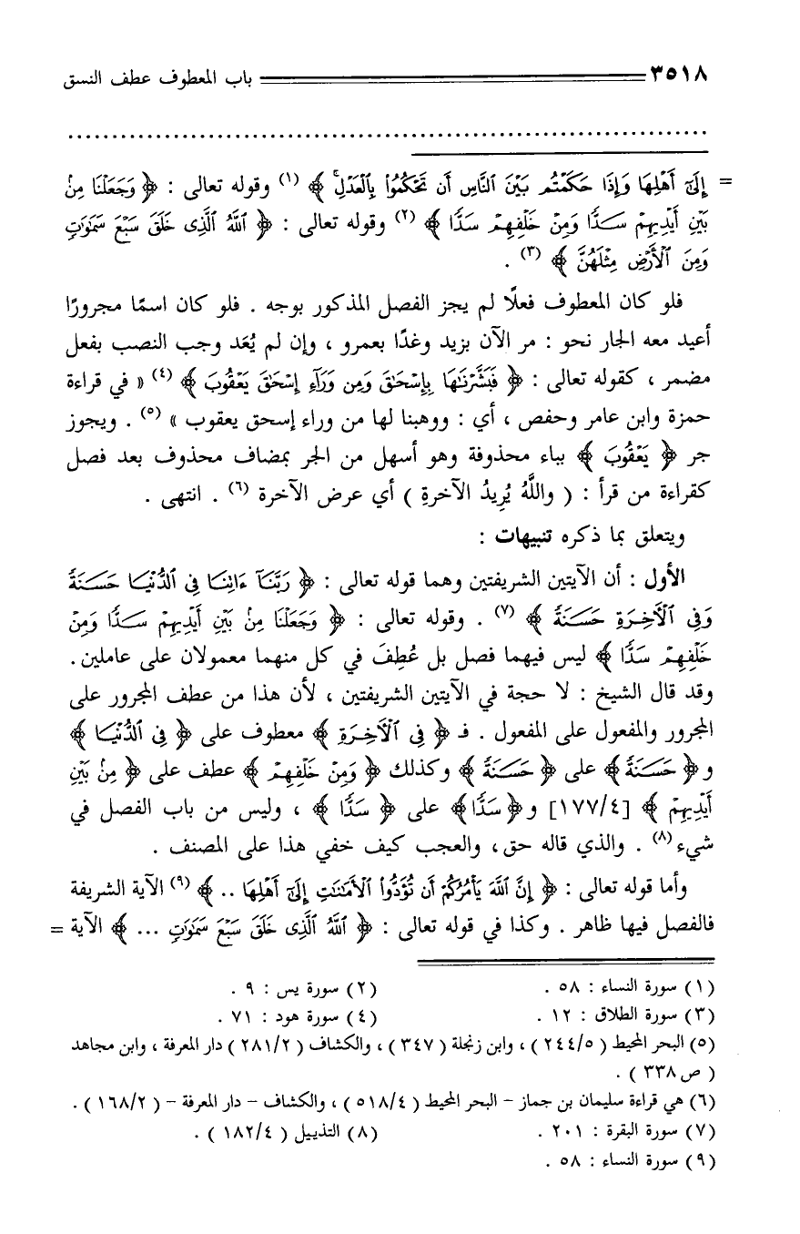 إِلى أَهْلِها وَإِذا حَكَمْتُمْ بَيْنَ النَّاسِ أَنْ تَحْكُمُوا بِالْعَدْلِ (¬1) وقوله تعالى: وَجَعَلْنا مِنْ بَيْنِ أَيْدِيهِمْ سَدًّا وَمِنْ خَلْفِهِمْ سَدًّا (¬2) وقوله تعالى: اللَّهُ الَّذِي خَلَقَ سَبْعَ سَماواتٍ وَمِنَ الْأَرْضِ مِثْلَهُنَّ (¬3).