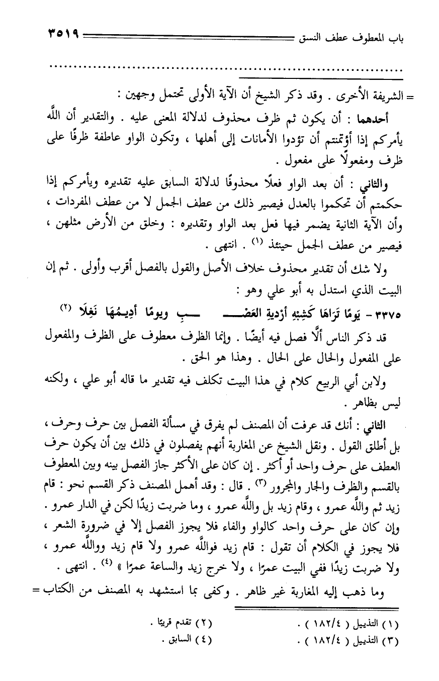والثاني: أن بعد الواو فعلا محذوفا لدلالة السابق عليه تقديره ويأمركم إذا حكمتم أن تحكموا بالعدل فيصير ذلك من عطف الجمل لا من عطف المفردات، وأن الآية الثانية يضمر فيها فعل بعد الواو وتقديره: وخلق من الأرض مثلهن، فيصير من عطف الجمل حينئذ (¬1). انتهى.