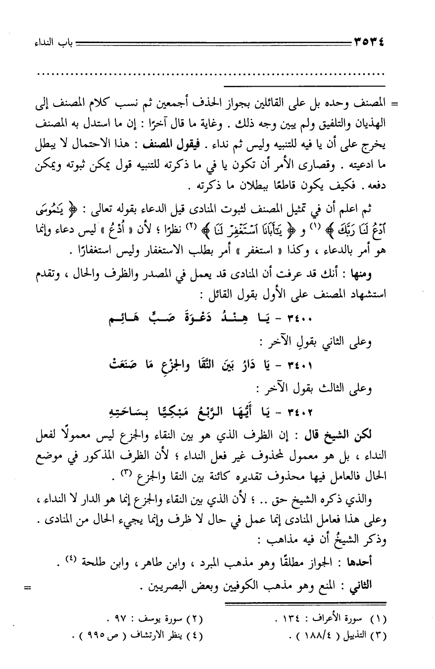 المصنف وحده بل على القائلين بجواز الحذف أجمعين ثم نسب كلام المصنف إلى الهذيان والتلفيق ولم يبين وجه ذلك. وغاية ما قال آخرا: إن ما استدل به المصنف يخرج على أن يا فيه للتنبيه وليس ثم نداء. فيقول المصنف: هذا الاحتمال لا يبطل ما ادعيته. وقصارى الأمر أن تكون يا في ما ذكرته للتنبيه قول يمكن ثبوته ويمكن دفعه. فكيف يكون قاطعا ببطلان ما ذكرته.