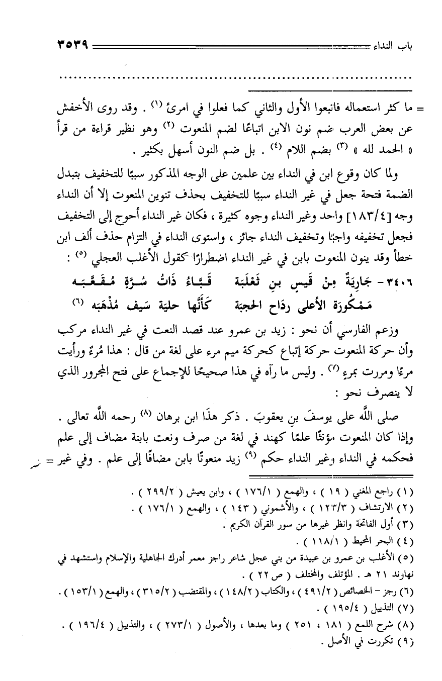 ولما كان وقوع ابن في النداء بين علمين على الوجه المذكور سببا للتخفيف بتبدل الضمة فتحة جعل في غير النداء سببا للتخفيف بحذف تنوين المنعوت إلا أن النداء وجه [4/ 183] واحد وغير النداء وجوه كثيرة، فكان غير النداء أحوج إلى التخفيف فجعل تخفيفه واجبا وتخفيف النداء جائز، واستوى النداء في التزام حذف ألف ابن خطأ وقد ينون المنعوت بابن في غير النداء اضطرارا كقول الأغلب العجلي (¬5):