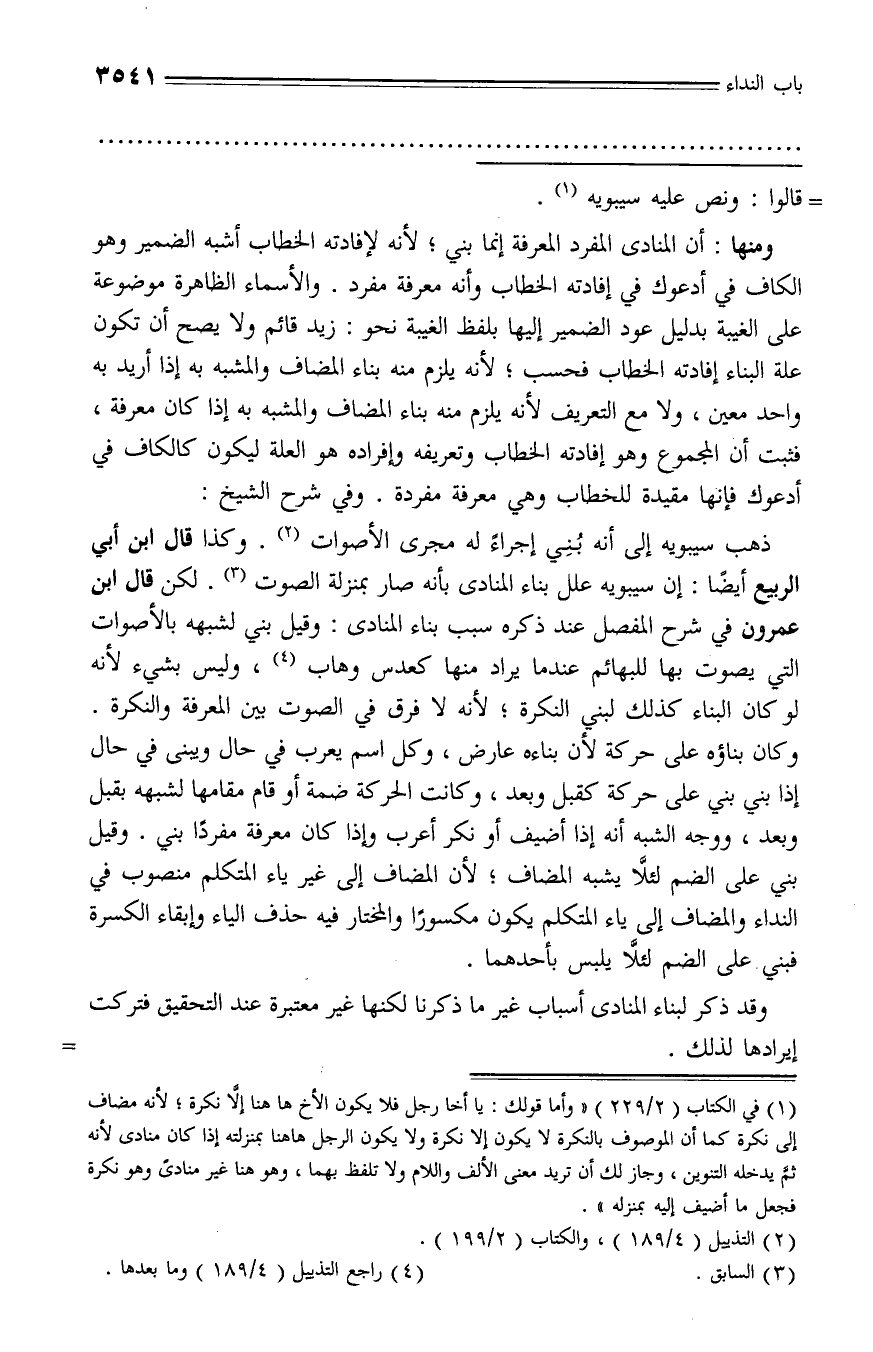 ومنها: أن المنادى المفرد المعرفة إنما بني؛ لأنه لإفادته الخطاب أشبه الضمير وهو الكاف في أدعوك في إفادته الخطاب وأنه معرفة مفرد. والأسماء الظاهرة موضوعة على الغيبة بدليل عود الضمير إليها بلفظ الغيبة نحو: زيد قائم ولا يصح أن تكون علة البناء إفادته الخطاب فحسب؛ لأنه يلزم منه بناء المضاف والمشبه به إذا أريد به واحد معين، ولا مع التعريف لأنه يلزم منه بناء المضاف والمشبه به إذا كان معرفة، فثبت أن المجموع وهو إفادته الخطاب وتعريفه وإفراده هو العلة ليكون كالكاف في أدعوك فإنها مقيدة للخطاب وهي معرفة مفردة. وفي شرح الشيخ: