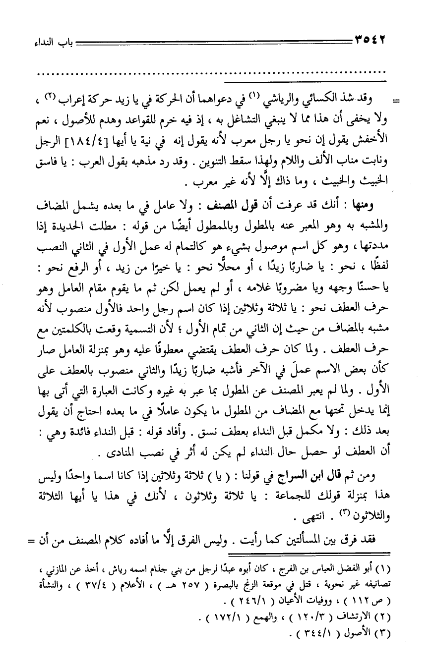 وقد شذ الكسائي والرياشي (¬1) في دعواهما أن الحركة في يا زيد حركة إعراب (¬2)، ولا يخفى أن هذا مما لا ينبغي التشاغل به، إذ فيه خرم للقواعد وهدم للأصول، نعم الأخفش يقول إن نحو يا رجل معرب لأنه يقول إنه في نية يا أيها [4/ 184] الرجل ونابت مناب الألف واللام ولهذا سقط التنوين. وقد رد مذهبه بقول العرب: يا فاسق الخبيث والخبيث، وما ذاك إلّا لأنه غير معرب.