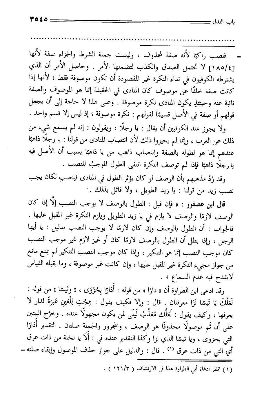 قال ابن عصفور: «فإن قيل: الطول بالوصف لا يوجب النصب إلّا إذا كان الوصف لازما والوصف لا يلزم في يا زيد الطويل ويلزم النكرة غير المقبل عليها.