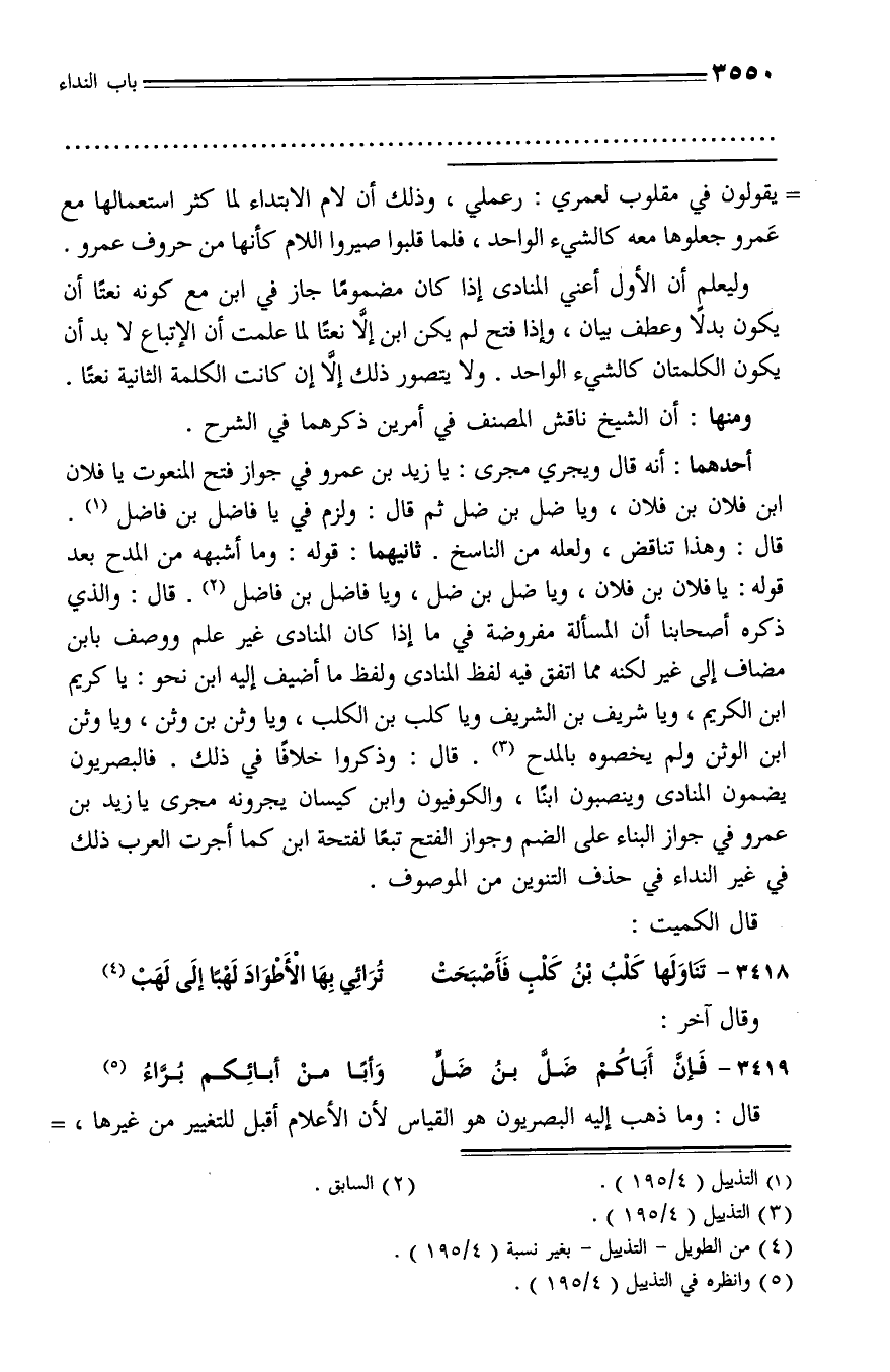 أحدهما: أنه قال ويجري مجرى: يا زيد بن عمرو في جواز فتح المنعوت يا فلان ابن فلان بن فلان، ويا ضل بن ضل ثم قال: ولزم في يا فاضل بن فاضل (¬1).