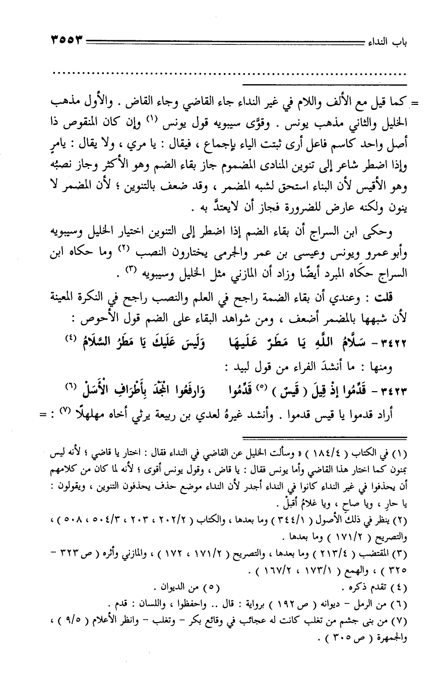(¬1) في الكتاب (4/ 184) «وسألت الخليل عن القاضي في النداء فقال: اختار يا قاضي؛ لأنه ليس بمنون كما اختار هذا القاضي وأما يونس فقال: يا قاض، وقول يونس أقوى؛ لأنه لما كان من كلامهم أن يحذفوا في غير النداء كانوا في النداء أجدر لأن النداء موضع حذف يحذفون التنوين، ويقولون: