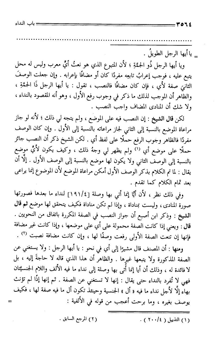ويا أيها الرجل ذو الجمّة؛ لأن المتبوع الذي هو نعت أيّ معرب وليس له محل يتبع عليه، فوجب إعراب تابعه مفردا كان أو مضافا بإعرابه. وإن جعلت الوصف الثاني صفة لأي، فإن كان مضافا فالنصب، تقول: يا أيها الرجل ذا الجمّة، والظاهر أن الموجب لذلك ما ذكر في وجوب رفع الأول، وهو أنه المقصود بالنداء، ولا شك أن المنادى المضاف واجب النصب.