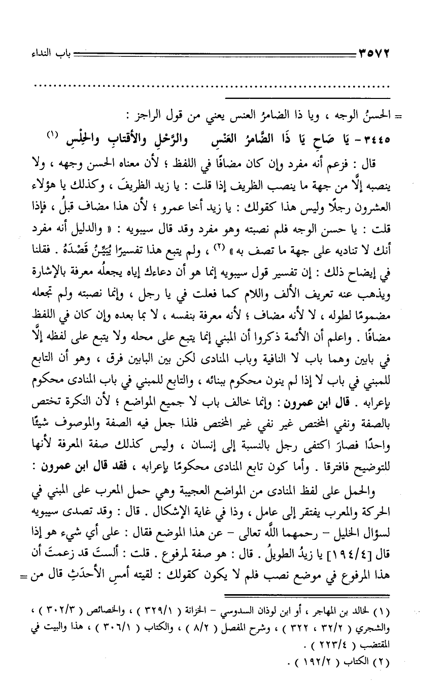 قال: فزعم أنه مفرد وإن كان مضافا في اللفظ؛ لأن معناه الحسن وجهه، ولا ينصبه إلّا من جهة ما ينصب الظريف إذا قلت: يا زيد الظريف، وكذلك يا هؤلاء العشرون رجلا وليس هذا كقولك: يا زيد أخا عمرو؛ لأن هذا مضاف قبل، فإذا قلت: يا حسن الوجه فلم نصبته وهو مفرد وقد قال سيبويه: «والدليل أنه مفرد أنك لا تناديه على جهة ما تصف به» (¬2)، ولم يتبع هذا تفسيرا يبيّن قصده. فقلنا في إيضاح ذلك: إن تفسير قول سيبويه إنما هو أن دعاءك إياه يجعله معرفة بالإشارة ويذهب عنه تعريف الألف واللام كما فعلت في يا رجل، وإنما نصبته ولم تجعله مضموما لطوله، لا لأنه مضاف؛ لأنه معرفة بنفسه، لا بما بعده وإن كان في اللفظ مضافا. واعلم أن الأئمة ذكروا أن المبني إنما يتبع على محله ولا يتبع على لفظه إلّا في بابين وهما باب لا النافية وباب المنادى لكن بين البابين فرق، وهو أن التابع للمبني في باب لا إذا لم ينون محكوم ببنائه، والتابع للمبني في باب المنادى محكوم بإعرابه. قال ابن عمرون: وإنما خالف باب لا جميع المواضع؛ لأن النكرة تختص بالصفة ونفي المختص غير نفي غير