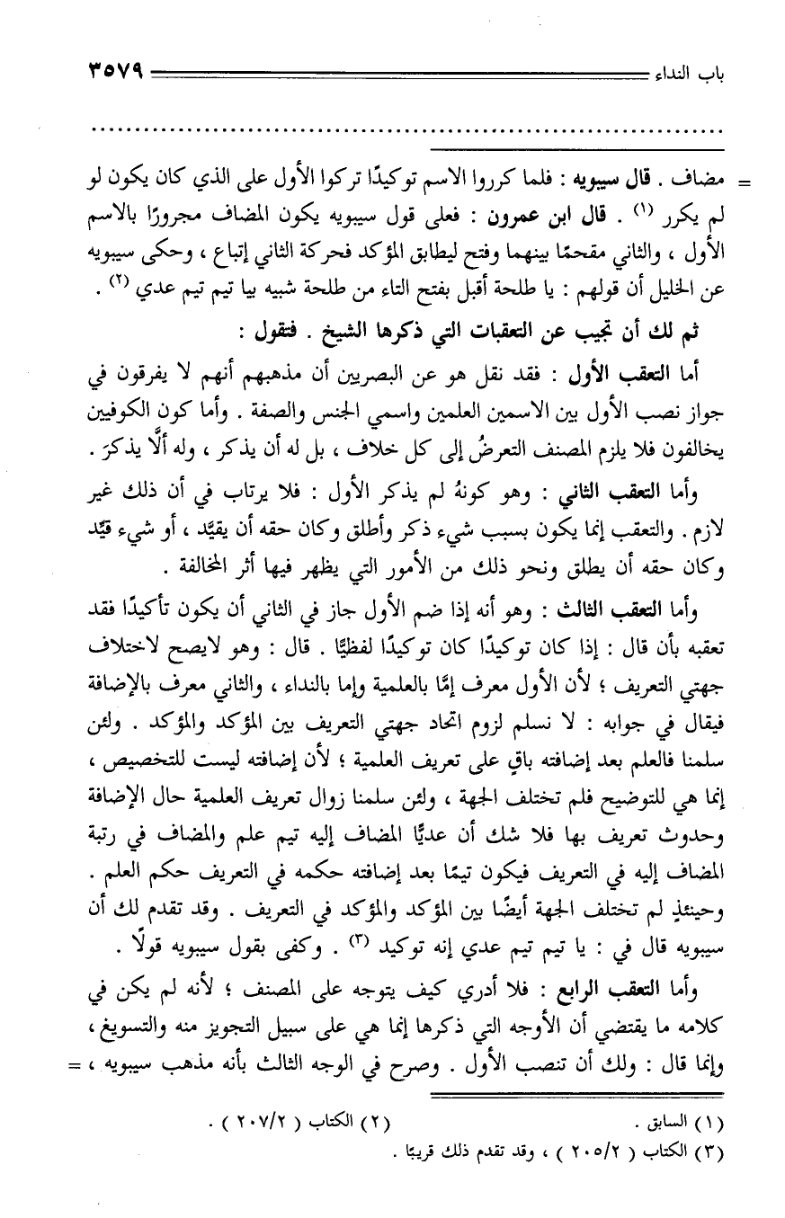 وأما التعقب الثالث: وهو أنه إذا ضم الأول جاز في الثاني أن يكون تأكيدا فقد تعقبه بأن قال: إذا كان توكيدا كان توكيدا لفظيّا. قال: وهو لا يصح لاختلاف جهتي التعريف؛ لأن الأول معرف إمّا بالعلمية وإما بالنداء، والثاني معرف بالإضافة فيقال في جوابه: لا نسلم لزوم اتحاد جهتي التعريف بين المؤكد والمؤكد. ولئن سلمنا فالعلم بعد إضافته باق على تعريف العلمية؛ لأن إضافته ليست للتخصيص، إنما هي للتوضيح فلم تختلف الجهة، ولئن سلمنا زوال تعريف العلمية حال الإضافة وحدوث تعريف بها فلا شك أن عديّا المضاف إليه تيم علم والمضاف في رتبة المضاف إليه في التعريف فيكون تيما بعد إضافته حكمه في التعريف حكم العلم.