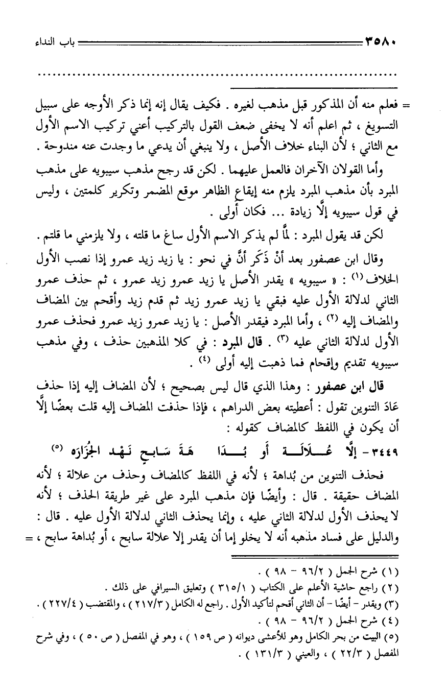 وقال ابن عصفور بعد أن ذكر أنّ في نحو: يا زيد زيد عمرو إذا نصب الأول الخلاف (¬1): «سيبويه» يقدر الأصل يا زيد عمرو زيد عمرو، ثم حذف عمرو الثاني لدلالة الأول عليه فبقي يا زيد عمرو زيد ثم قدم زيد وأقحم بين المضاف والمضاف إليه (¬2)، وأما المبرد فيقدر الأصل: يا زيد عمرو زيد عمرو فحذف عمرو الأول لدلالة الثاني عليه (¬3). قال المبرد: في كلا المذهبين حذف، وفي مذهب سيبويه تقديم وإقحام فما ذهبت إليه أولى (¬4).