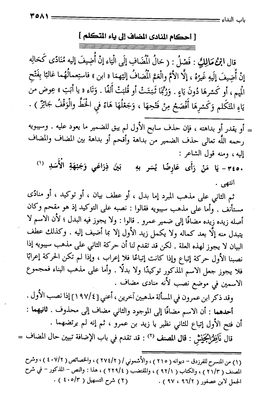 قال ابن مالك: فصل: (حال المضاف إلى الياء إن أضيف إليه منادى كحاله إن أضيف إليه غيره، إلّا الأمّ والعمّ المضاف إليهما «ابن» فاستعمالهما غالبا بفتح الميم، أو كسرها دون ياء. وربّما ثبتت أو قلبت ألفا. وتاء «يا أبت» عوض من ياء المتكلم وكسرها أفصح من فتحها، وجعلها هاء في الخطّ والوقف جائز).