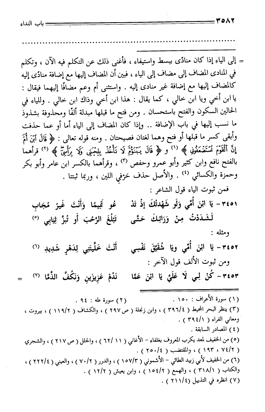 يا ابن أخي ويا ابن خالي، كما يقال: هذا ابن أخي وذاك ابن خالي. وللياء في الحالين السكون والفتح باستحسان. ومن فتح ما قبلها مبدلة ألفا ومحذوفة بشذوذ ما نسب إليها في باب الإضافة .. وإذا كان المضاف إلى الياء أما أو عما حذفت وأبقى كسر ما قبلها أو فتح وهما لغتان فصيحتان. ومنه قوله تعالى: قالَ ابْنَ أُمَّ إِنَّ الْقَوْمَ اسْتَضْعَفُونِي (¬1) وقالَ يَا بْنَ أُمَّ لا تَأْخُذْ بِلِحْيَتِي وَلا بِرَأْسِي (¬2) قرأهما بالفتح نافع وابن كثير وأبو عمرو وحفص (¬3)، وقرأهما بالكسر ابن عامر وأبو بكر وحمزة والكسائي (¬4). والأصل حذف حرفي اللين، وربما ثبتتا.