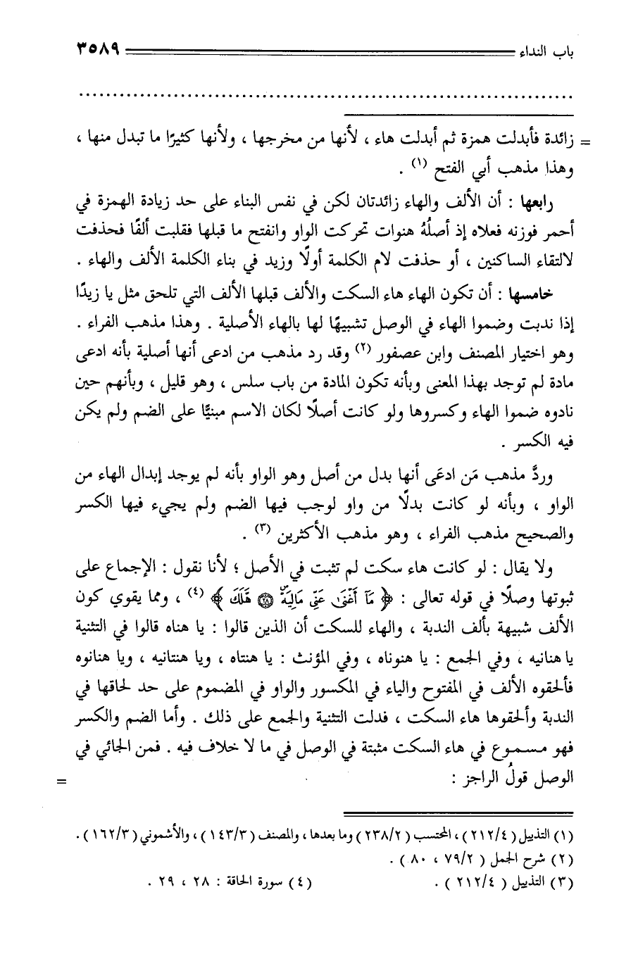 ولا يقال: لو كانت هاء سكت لم تثبت في الأصل؛ لأنا نقول: الإجماع على ثبوتها وصلا في قوله تعالى: ما أَغْنى عَنِّي مالِيَهْ 28 هَلَكَ (¬4)، ومما يقوي كون الألف شبيهة بألف الندبة، والهاء للسكت أن الذين قالوا: يا هناه قالوا في التثنية يا هنانيه، وفي الجمع: يا هنوناه، وفي المؤنث: يا هنتاه، ويا هنتانيه، ويا هنانوه فألحقوه الألف في المفتوح والياء في المكسور والواو في المضموم على حد لحاقها في الندبة وألحقوها هاء السكت، فدلت التثنية والجمع على ذلك. وأما الضم والكسر فهو مسموع في هاء السكت مثبتة في الوصل في ما لا خلاف فيه. فمن الجائي في الوصل قول الراجز: -