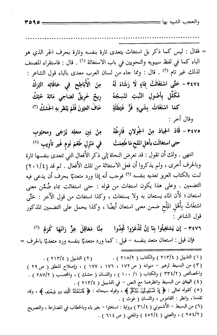 انتهى. ولك أن تقول: قد تعرض النحاة إلى ذكر الأفعال التي تتعدى بنفسها تارة وبالحرف أخرى، ولم يذكروا أن فعل الاستغاثة من تلك الأفعال. ثم قد [4/ 201] ثبت بالكتاب العزيز تعديه بنفسه (¬5) فوجب أنه إذا ورد متعديا بحرف أن يدعى فيه التضمين. وعلى هذا يكون استغاث من قوله: حتى استغاثت بماء ضمّن معنى استعان؛ لأن الماء يستعان به ولا يستغاث، وكذا استغاث من قول الآخر: حتّى استغاث بأهل الملح ضمن معنى استعان أيضا، وكذا يحمل على التضمين المذكور قول الشاعر: