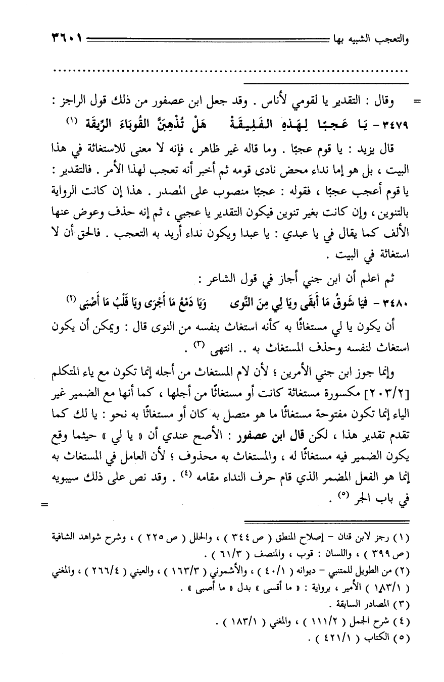 وإنما جوز ابن جني الأمرين؛ لأن لام المستغاث من أجله إنما تكون مع ياء المتكلم [2/ 203] مكسورة مستغاثة كانت أو مستغاثا من أجلها، كما أنها مع الضمير غير الياء إنما تكون مفتوحة مستغاثا ما هو متصل به كان أو مستغاثا به نحو: يا لك كما تقدم تقدير هذا، لكن قال ابن عصفور: الأصح عندي أن «يا لي» حيثما وقع يكون الضمير فيه مستغاثا له، والمستغاث به محذوف؛ لأن العامل في المستغاث به إنما هو الفعل المضمر الذي قام حرف النداء مقامه (¬4). وقد نص على ذلك سيبويه في باب الجر (¬5). -