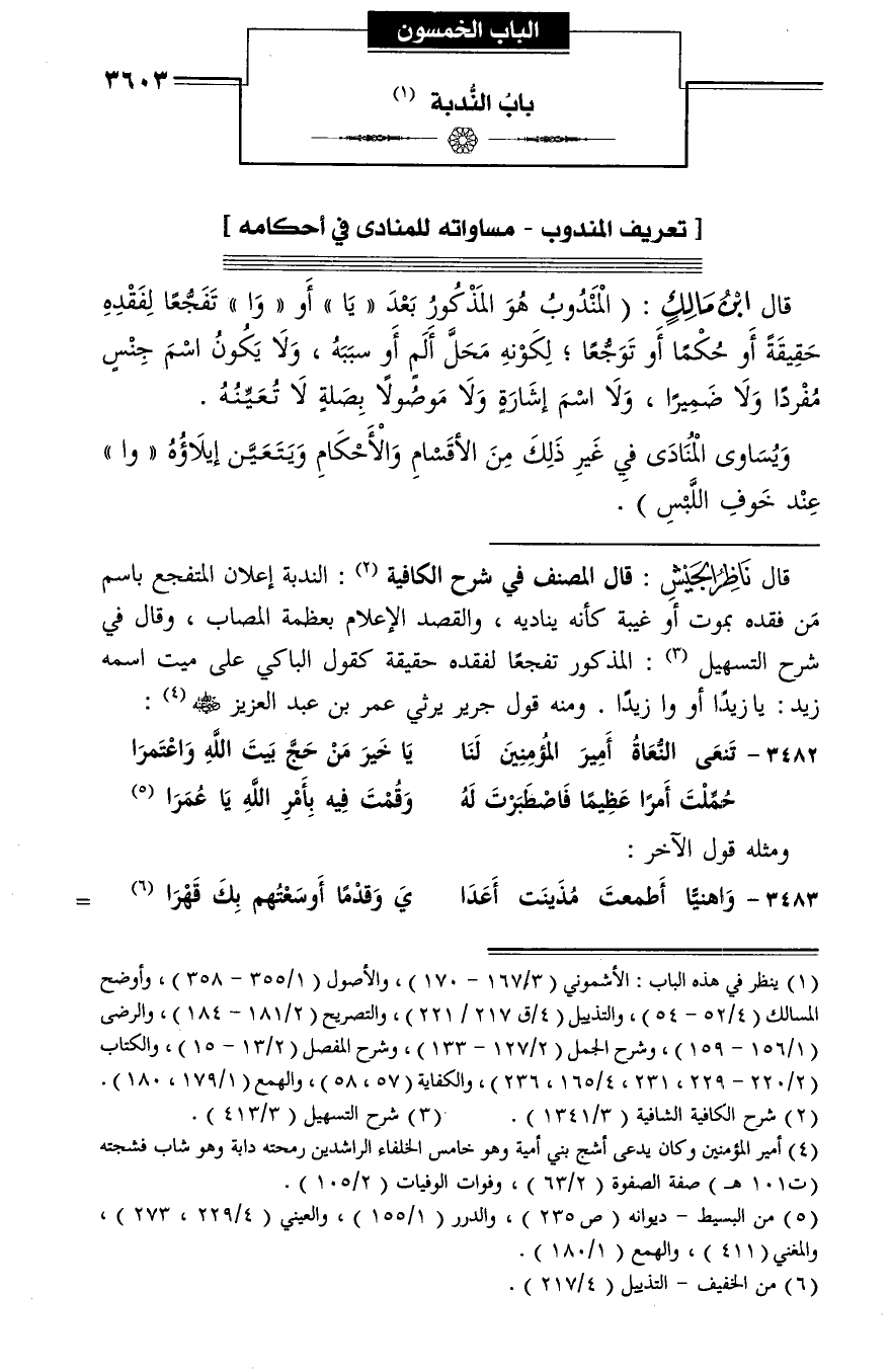 قال ناظر الجيش: قال المصنف في شرح الكافية (¬2): الندبة إعلان المتفجع باسم من فقده بموت أو غيبة كأنه يناديه، والقصد الإعلام بعظمة المصاب، وقال في شرح التسهيل (¬3): المذكور تفجعا لفقده حقيقة كقول الباكي على ميت اسمه زيد: يا زيدا أو وا زيدا. ومنه قول جرير يرثي عمر بن عبد العزيز رضي الله عنه (¬4):