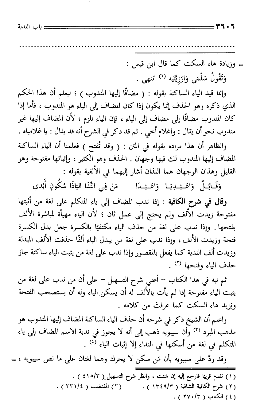 ثم نبه في هذا الكتاب - أعني شرح التسهيل - على أن من ندب على لغة من يثبت الياء مفتوحة إذا لم يأت بالألف له أن يسكن الياء وله أن يستصحب الفتحة ويزيد هاء السكت كما عرفت من كلامه.