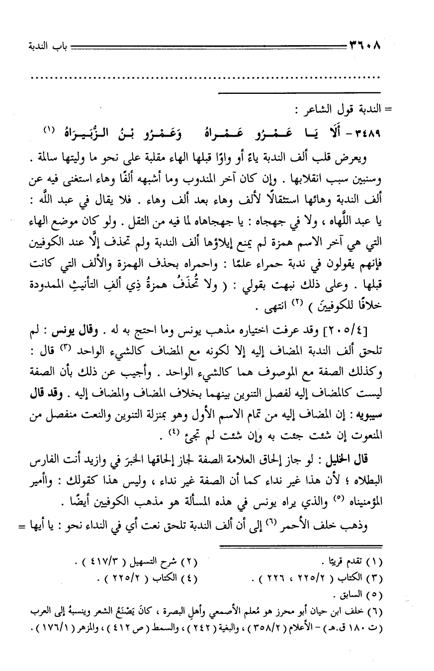 [4/ 205] وقد عرفت اختياره مذهب يونس وما احتج به له. وقال يونس: لم تلحق ألف الندبة المضاف إليه إلا لكونه مع المضاف كالشيء الواحد (¬3) قال: