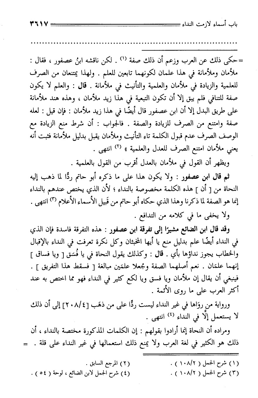ثم قال ابن عصفور: ولا يكون هذا على ما ذكره أبو حاتم ردّا لما ذهب إليه النحاة من [أن] هذه الكلمة مخصوصة بالنداء؛ لأن الذي يختص عندهم بالنداء إنما هو الصفة لما ذكرنا وهذا الذي حكاه أبو حاتم من قبيل الأسماء الأعلام (¬3) انتهى.
