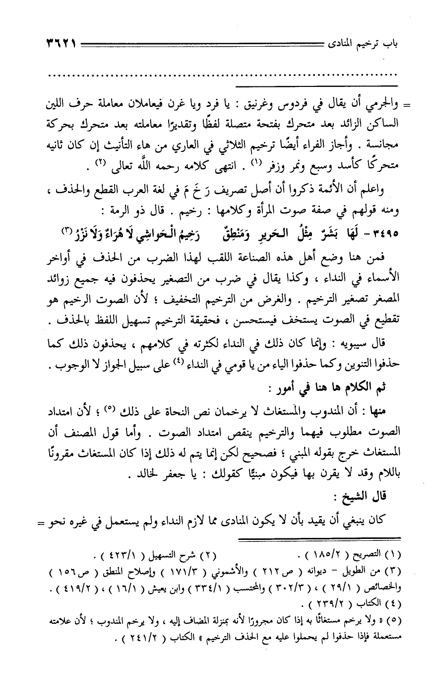 (¬5) «ولا يرخم مستغاثا به إذا كان مجرورا لأنه بمنزلة المضاف إليه، ولا يرخم المندوب؛ لأن علامته مستعملة فإذا حذفوا لم يحملوا عليه مع الحذف الترخيم» الكتاب (2/ 241).