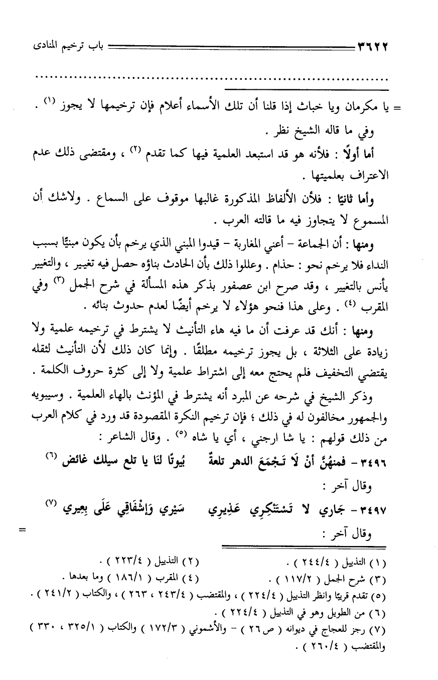 وذكر الشيخ في شرحه عن المبرد أنه يشترط في المؤنث بالهاء العلمية. وسيبويه والجمهور مخالفون له في ذلك؛ فإن ترخيم النكرة المقصودة قد ورد في كلام العرب من ذلك قولهم: يا شا ارجني، أي يا شاه (¬5). وقال