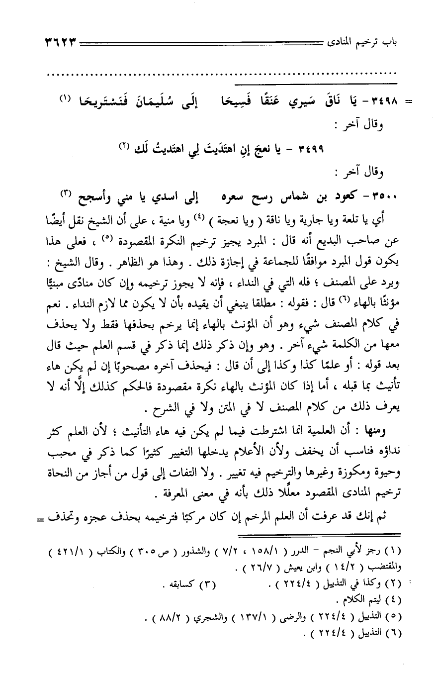 ومنها: أن العلمية انما اشترطت فيما لم يكن فيه هاء التأنيث؛ لأن العلم كثر نداؤه فناسب أن يخفف ولأن الأعلام يدخلها التغيير كثيرا كما ذكر في محبب وحيوة ومكوزة وغيرها والترخيم فيه تغيير. ولا التفات إلى قول من أجاز من النحاة ترخيم المنادى المقصود معلّلا ذلك بأنه في معنى المعرفة.