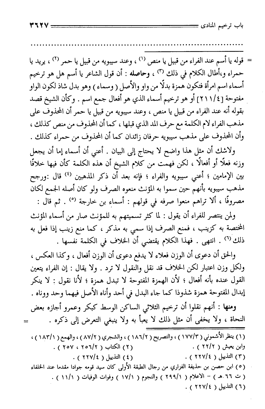 قوله يا أسم عند الفراء من قبيل يا منص (¬1)، وعند سيبويه من قبيل يا حمر (¬2)، يريد يا حمراء و، أطال الكلام في ذلك (¬3)، وحاصله: أن قول الشاعر يا أسم هل هو ترخيم أسماء اسم امرأة فتكون همزة بدلا من واو والأصل (وسماء) وهو بدل شاذ لكون الواو مفتوحة [4/ 211] أو هو ترخيم أسماء الذي هو أفعال جمع اسم. وكأن الشيخ قصد بقوله أنه عند الفراء من قبيل يا منص، وعند سيبويه من قبيل يا حمر أن المحذوف على مذهب الفراء لام الكلمة مع حرف المد الذي قبلها، كما أن المحذوف من منص كذلك، وأن المحذوف على مذهب سيبويه حرفان زائدان كما أن المحذوف من حمراء كذلك.