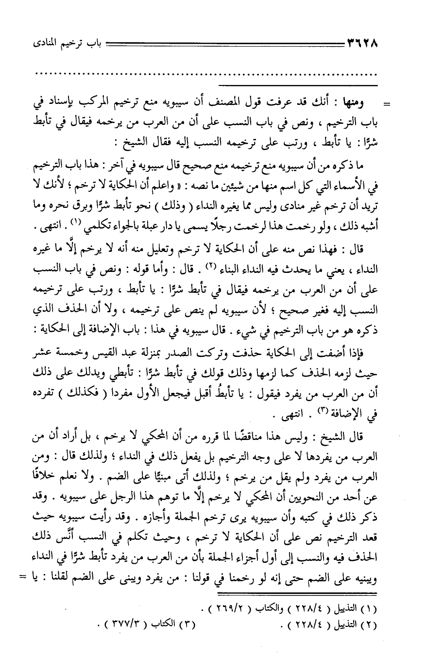 ولا نعلم خلافا عن أحد من النحويين أن المحكي لا يرخم إلّا ما توهم هذا الرجل على سيبويه. وقد ذكر ذلك في كتبه وأن سيبويه يرى ترخم الجملة وأجازه. وقد رأيت سيبويه حيث قعد الترخيم نص على أن الحكاية لا ترخم، وحيث تكلم في النسب أنّس ذلك الحذف فيه والنسب إلى أول أجزاء الجملة بأن من العرب من يفرد تأبط شرّا في النداء ويبنيه على الضم حتى إنه لو رخمنا في قولنا: من يفرد ويبنى على الضم لقلنا: يا -